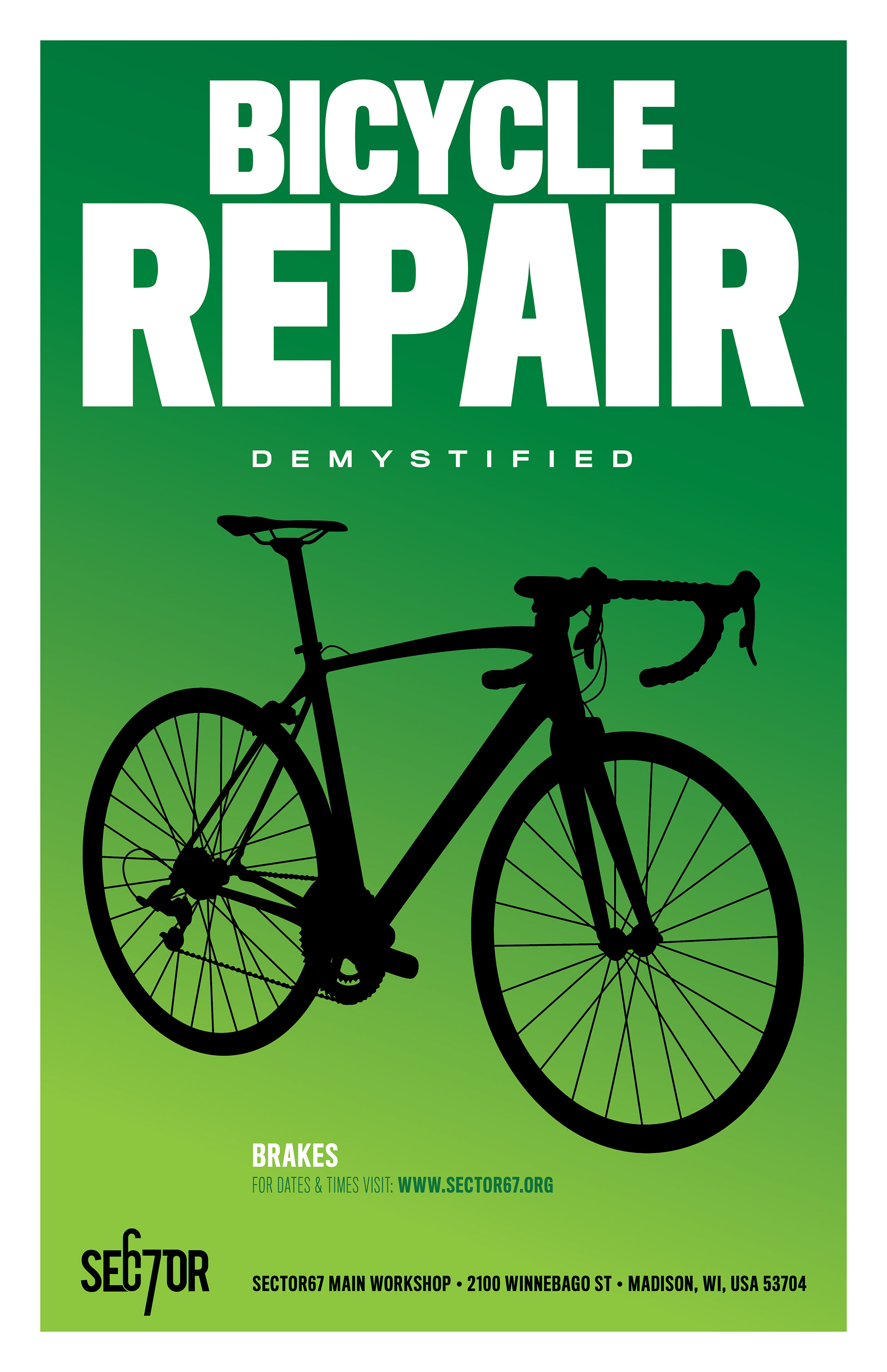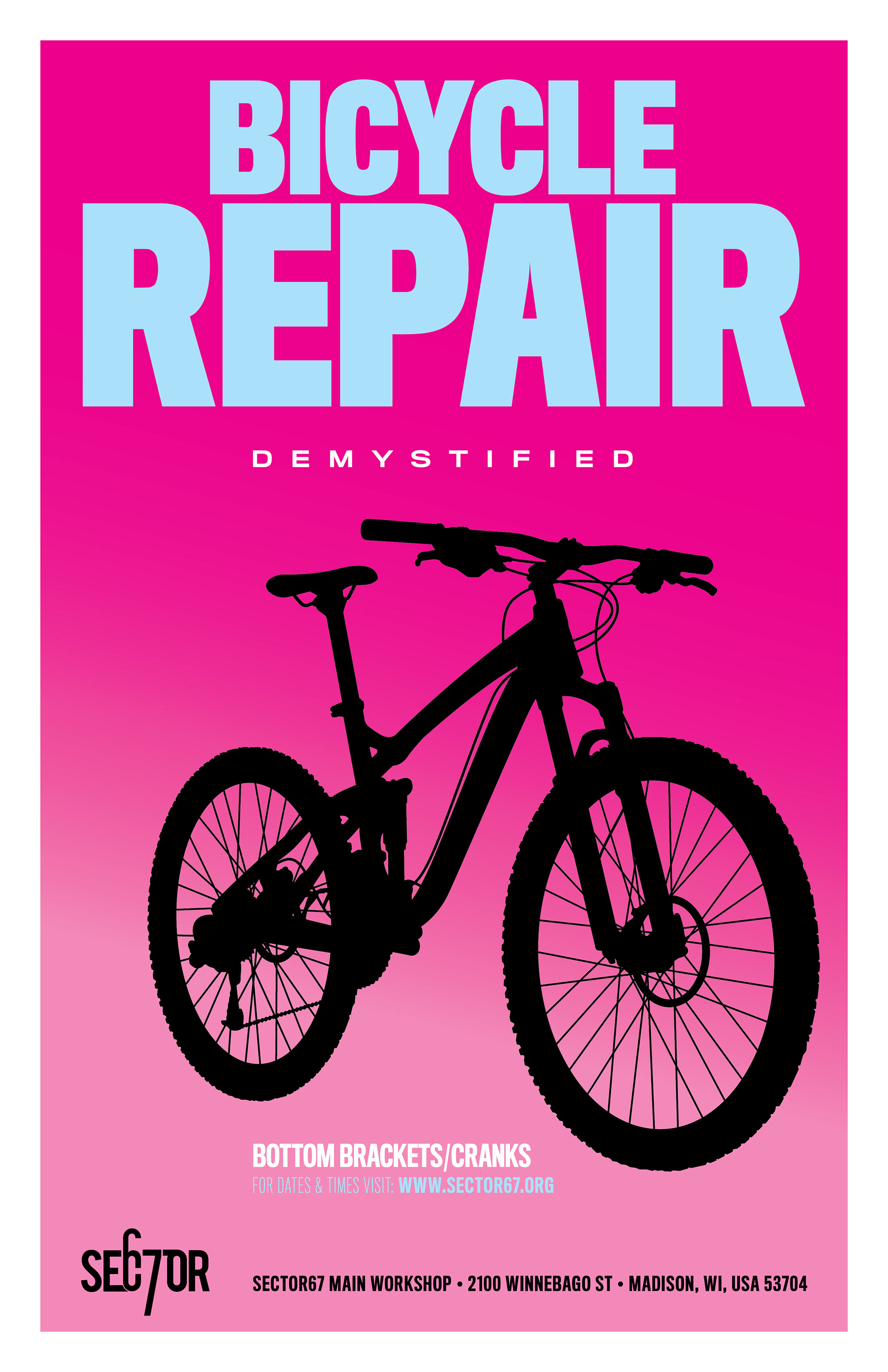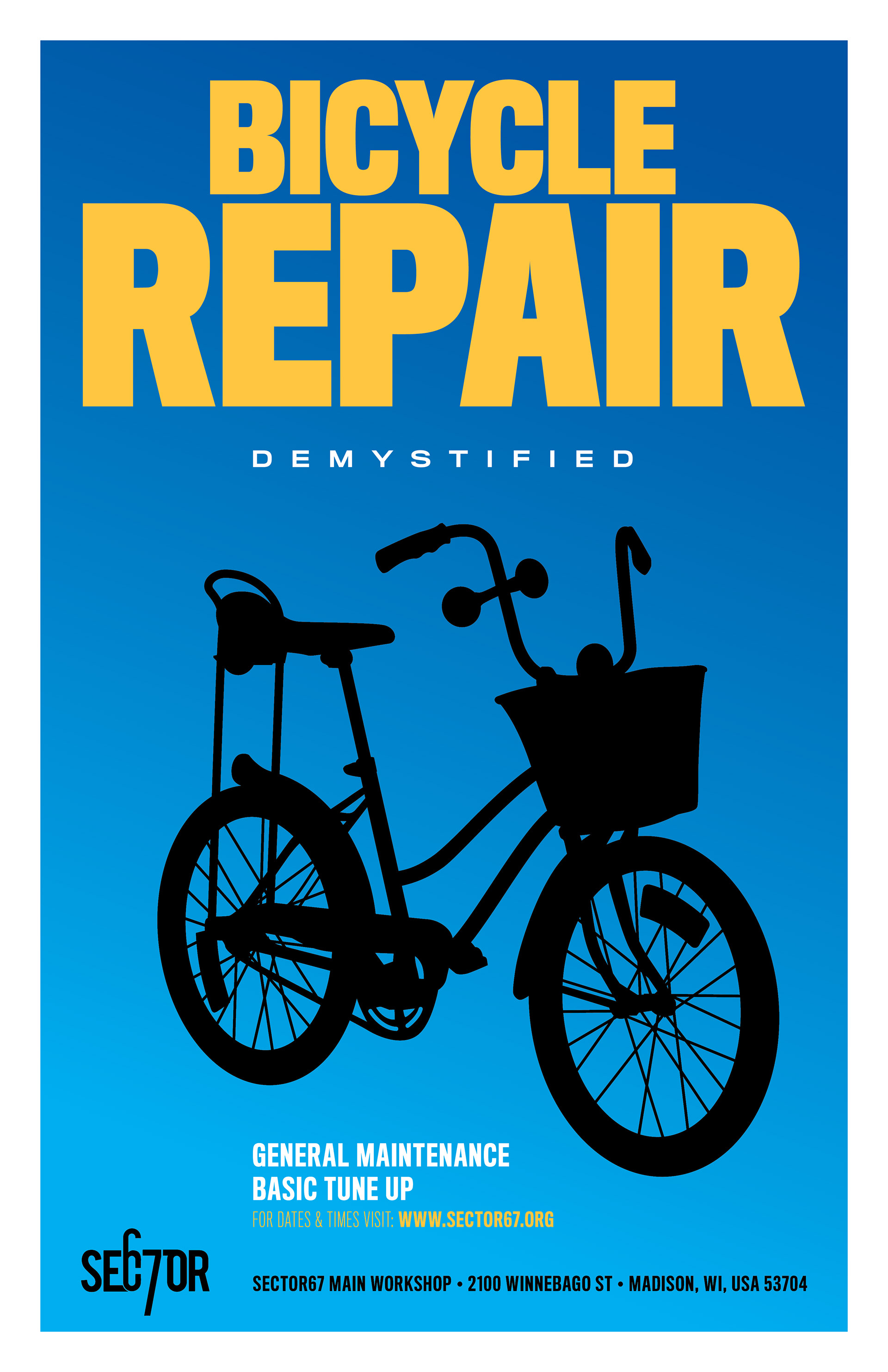 Bicycle Repair Fliers. A mechanic hired me to design fliers to promote a series of workshops in Madison's Sector 67 maker space. I illustrated multiple bike styles and used bold colors to keep each flier fun and interesting.